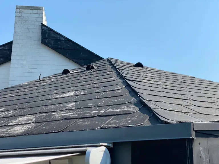 Dieses Dach wurde auch vom selben Firma aus Hessen gereinigt, es handelt sich um ein Dach aus Asbest-Schindeln. Asbest darf man nicht reinigen. Die Firma und Hausbesitzer müssen mit einer empfindlichen Strafe rechnen.